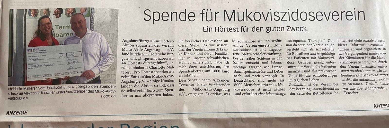 Der Verein Muko-Aktiv Augsburg freut sich über eine großzügige Spende in Höhe von 1.000 Euro, die vom Hörstudio Burgau überreicht wurde. Wir danken Frau Charlotte Malterer, Inhaberin des Hörstudios, sowie ihrem gesamten Team und all den Menschen, die uns unterstützt haben von Herzen für dieses besondere Engagement zugunsten von Menschen mit Mukoviszidose.